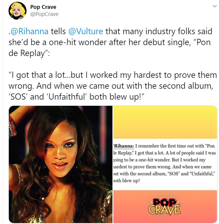 Cụ thể, Rihanna hồi tưởng về khoảnh khắc bị đánh giá là hiện tượng One Hit Wonder – hay còn gọi là hiện tượng vụt sáng sau một bản hit sau đó nhanh chóng lụi tàn, sau khi cô nàng vừa cho ra mắt tuyệt phẩm debut Pon De Replay. Giọng ca gốc Barbados chia sẻ: “Tôi còn nhớ sau khi tôi trở thành một hiện tượng âm nhạc sau bản hit đó (Pon De Replay), nhiều người kể cả các nhà sản xuất cũng đã đánh giá tôi sẽ chỉ là một hiện tượng One Hit Wonder. Nhưng tôi đã không để những lời bình luận ấy khuất phục tôi. Tôi quyết định đổ tâm huyết vào album phòng thu thứ 2 và đúng như dự đoán, sản phẩm đã tiếp tục khuấy đảo làng nhạc. Tôi đã chứng minh được rằng họ sai.” Dòng chia sẻ của nữ nghệ sĩ đã thu hút khá nhiều sự chú ý của dân mạng khắp nơi.