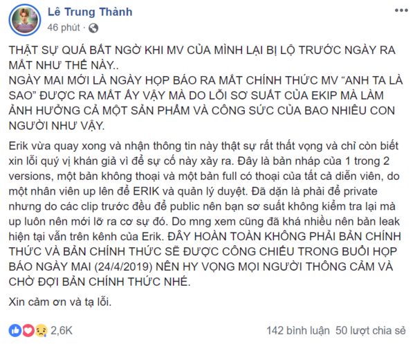Vào khoảng cuối tháng 4, Erik đã “thả thính” về màn comeback của mình mang tên Anh ta là sao khiến các fan vô cùng hào hứng. Tuy nhiên, chỉ một ngày trước khi lên sóng, nam ca sĩ lại chia sẻ một dòng trạng thái khá dài chia sẻ về việc MV bị leak trên mạng xã hội gây chú ý của người hâm mộ.