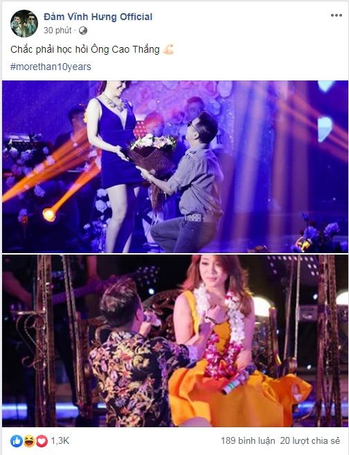 Trước đó, trên trang fanpage của mình, Đàm Vĩnh Hưng cũng khiến các fan vô cùng phấn khích khi đăng tải lại hình ảnh “tỏ tình” với Mỹ Tâm từ nhiều năm trước và dùng hashtag #morethan10years để ngầm ám chỉ cả hai có khoảng thời gian “bên nhau” còn nhiều hơn 10 năm. Dù đã nhiều năm trôi qua nhưng khán giả vẫn có thể cảm nhận được rõ tình cảm mà Đàm Vĩnh Hưng dành cho Mỹ Tâm là không hề thay đổi.