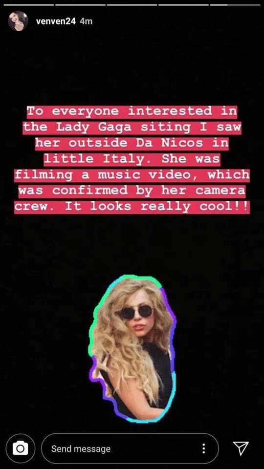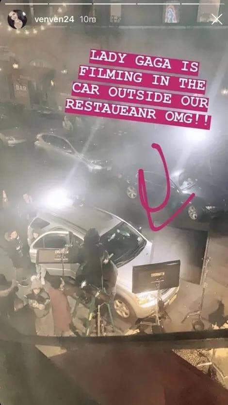 Cụ thể, trên Instagram story của một người hâm mộ may mắn đã xuất hiện hình ảnh Lady Gaga đang tiến hành quay phim trong một chiếc xe ô tô, ngay phía trước một nhà hàng Italia. Cô gái trên đã nhanh chóng quay lại hình ảnh trên và đăng tải lên mạng xã hội. Ngay lập tức, bức ảnh trên đã làm cộng đồng Little Monster xôn xao.