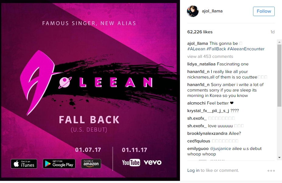 Mới đây, thông tin Ailee debut tại Mỹ được chia sẻ hàng loạt. Cụ thể, cô nàng sẽ có màn chào sân tại xứ Cờ Hoa với nghệ danh A.Leean. Bài hát chủ đề tên gọi Fall Back hứa hẹn mang đến nhiều điều bất ngờ. Nguồn tin được rò rỉ trên trang cá nhân của thành viên F(x) Amber (bạn thân của Ailee)