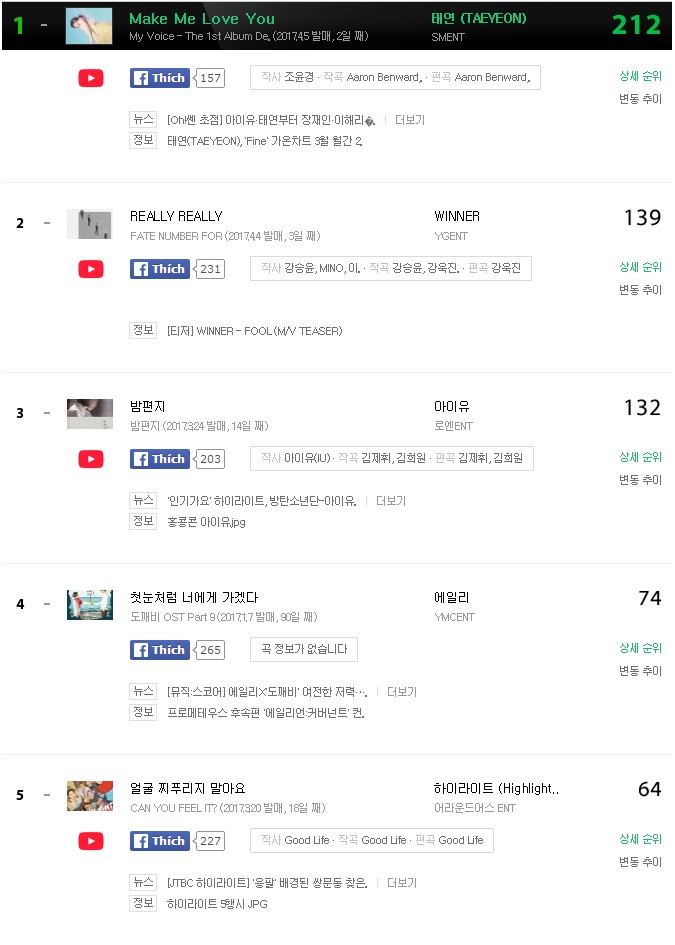 Trong đó, trận chiến giữa Taeyeon và WINNER đang hết sức căng thẳng bởi cả 2 đều vừa tung ca khúc mới. Make Me Love You và Really Really chiếm ngôi đầu bảng, tuy nhiên tính đến thời điểm hiện tại thì Make Me Love You của Taeyeon đang chiếm ưu thế hơn.