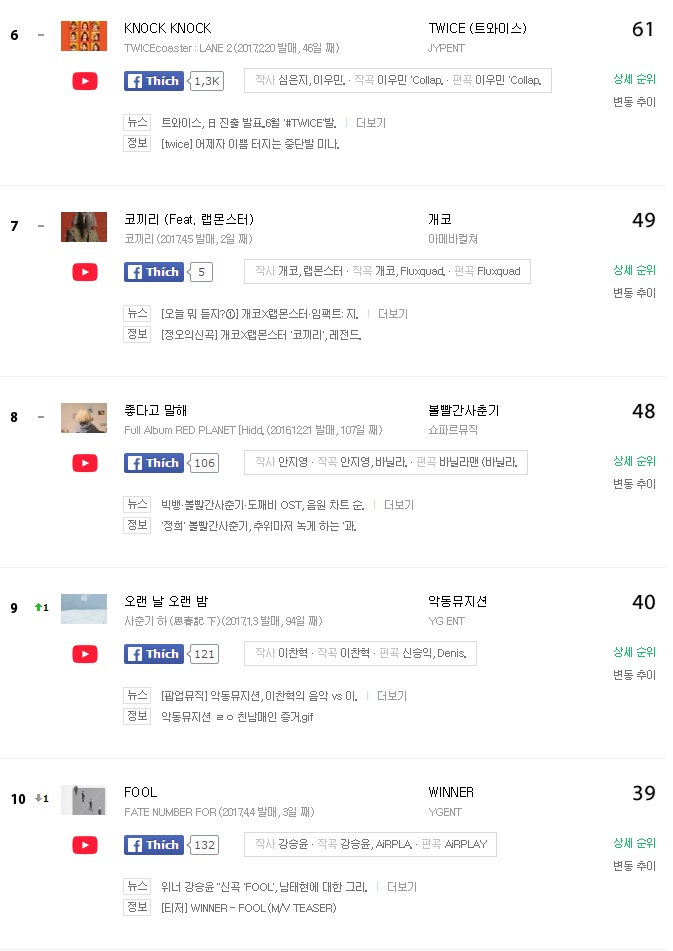 Các vị trí tiếp theo lần lượt thuộc về IU, Ailee, Highlight, TWICE, Gaeko & Rap Monster, Bolbbalgan4, Akdong Musician và 1 ca khúc khác của Taeyeon là Fine (BXH Ichart tính đến 15h chiều 6/4).