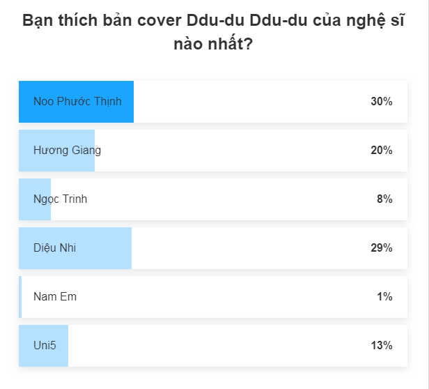 Mỗi nghệ sĩ đều có một cách riêng để thể hiện sự yêu thích của mình đối với Ddu-du Ddu-du. SAOstar đã thực hiện một cuộc bình chọn vui để đo mức độ yêu thích của khán giả với những gương mặt đình đám sau: