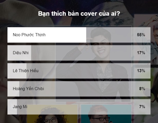 Và ngay sau khi bài viết Lộng lẫy - khí chất ngời ngời: Quên hình ảnh đó đi và xem loạt cover hit Bích Phương 'lầy' ngỡ ngàng từ sao Việt lên sóng, đông đảo độc giả của SAOstar đã quan tâm và tham gia bình chọn xem nghệ sĩ nào là người có màn cover ca khúc của Bích Phương gây ấn tượng nhất. Và kết quả xuất sắc đã thuộc về Noo Phước Thịnh khi phần trăm bình chọn của anh chiếm tỷ lệ áp đảo với 55%.