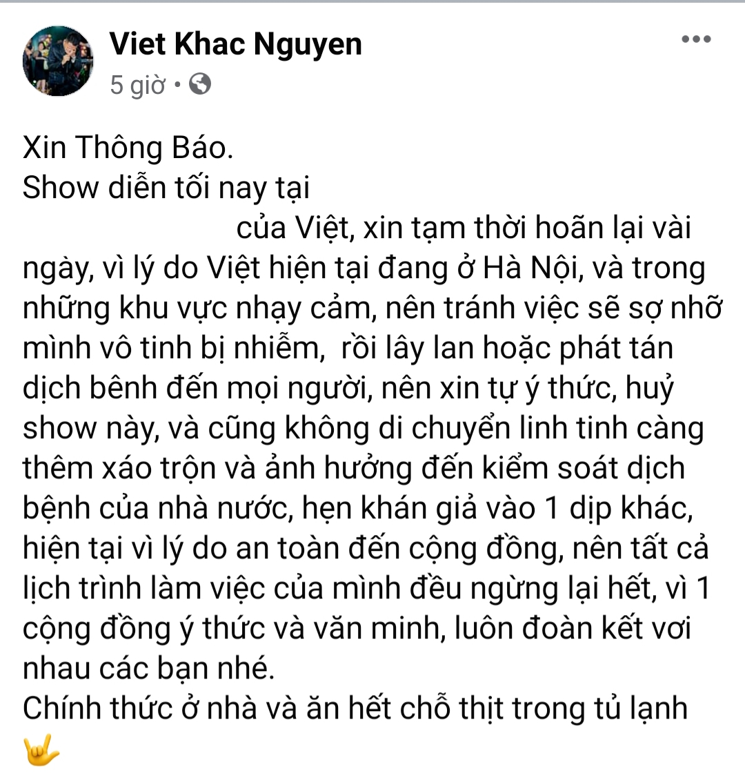 Khắc Việt hủy show để đảm bảo tình hình sức khỏe cho mọi người.