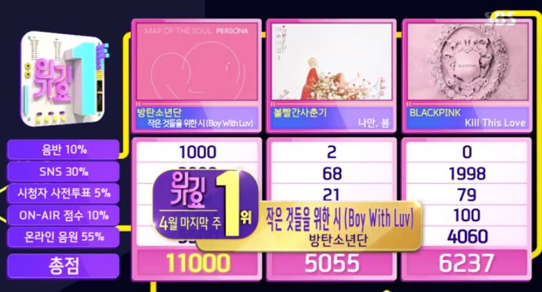 Đấu trường SBS Inkigayo tuần này là sự tranh tài của các ca khúc Boy With Luv (BTS), Kill This Luv (BlackPink) và Bom (Bol4). Cả ba đều là đối thủ nặng ký vì nhận được sự yêu thích của đông đảo người âm mộ trong suốt thời gian dài kể từ khi ra mắt. Kết quả cuối cùng, BTS giành chiến thắng thuyết phục cho Boy With Luv với điểm số tối đa 11000 cho tuần đầu tranh cúp.