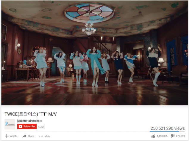 Chỉ sau hơn 9 tháng phát hành, hit cũ TT đã đem về cho TWICE kỷ lục mới với 250 triệu lượt xem trên Youtube. Không những là MV có lượng view khủng nhất của nhóm, TT còn trở thành ca khúc có lượng người xem nhiều nhất toàn Kpop trên trận địa girlgroup.