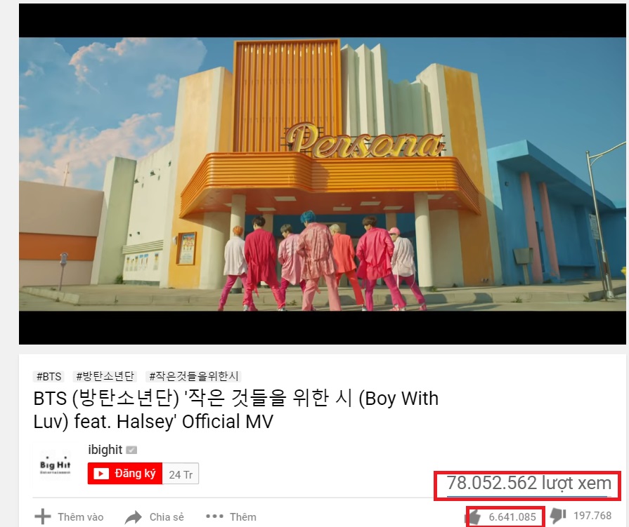 Và cuối cùng, sau 24 tiếng phát hành, số lượng lượt view mà người hâm mộ mong đợi đã được công bố: 78.052.562 lượt xem. Đồng thời, MV cũng đạt hơn 6,64 triệu lượt yêu thích. Đây đều là con số không tưởng đối với không chỉ MV Kpop mà bất cứ sản phẩm âm nhạc nào trên thế giới từ trước đến nay.