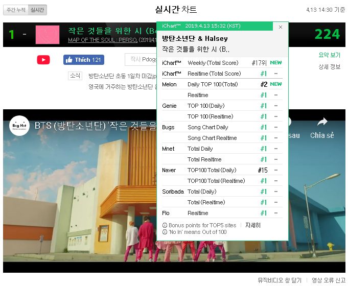 Trên các BXH âm nhạc Hàn Quốc, có thể thấy nhanh nhất tốc độ phát tán kinh người từ MV mới nhất của BTS qua iChart. Cụ thể, ca khúc nhanh chóng leo lên đỉnh BXH iChart chỉ sau 2 tiếng phát hành, đồng thời dẫn đầu nhiều BXH realtime trong nước. Chưa đầy 1 ngày, ca khúc đã đạt chứng nhận AK (All Kill) và chuẩn bị leo lên vị trí PAK (Perfect All Kill).
