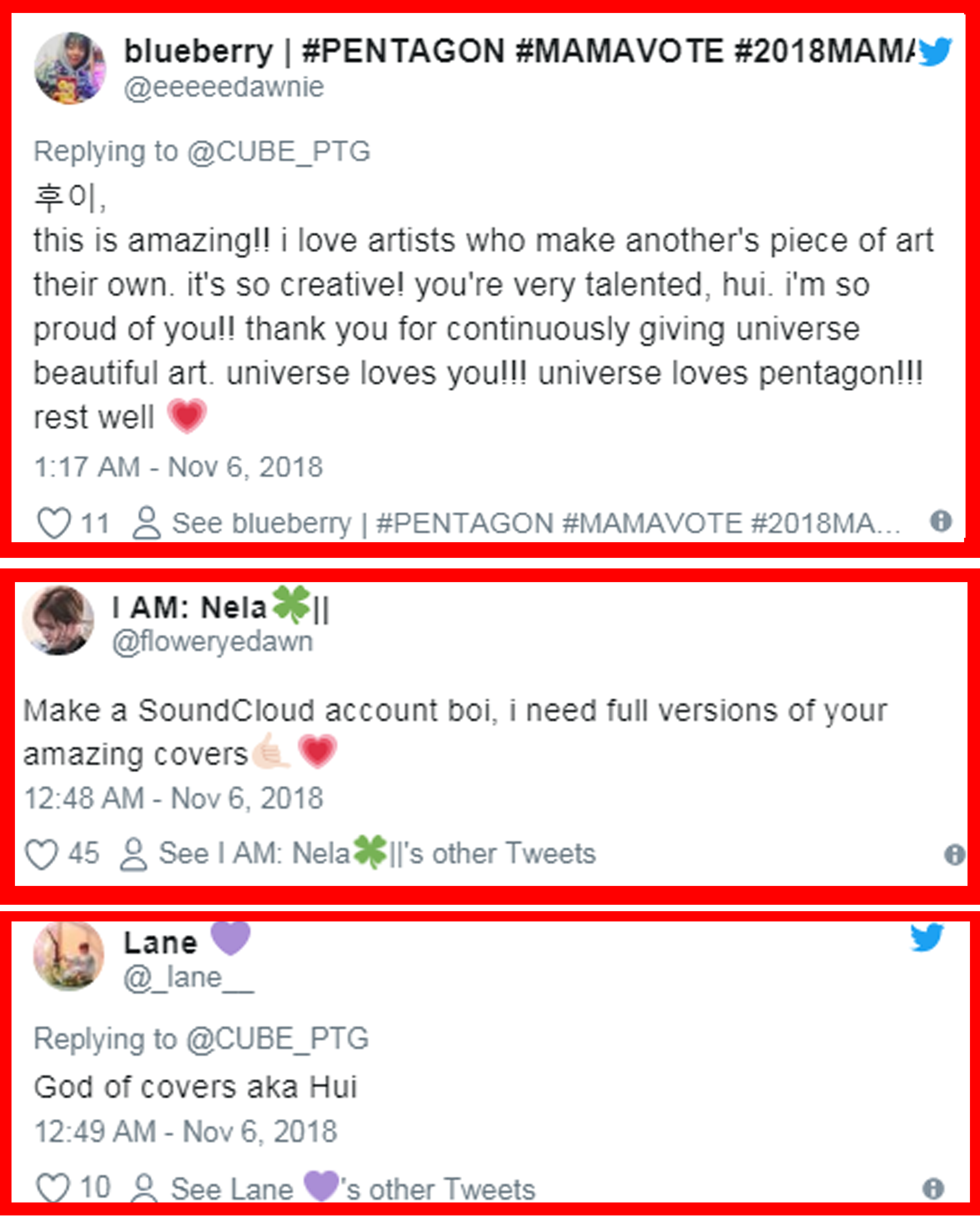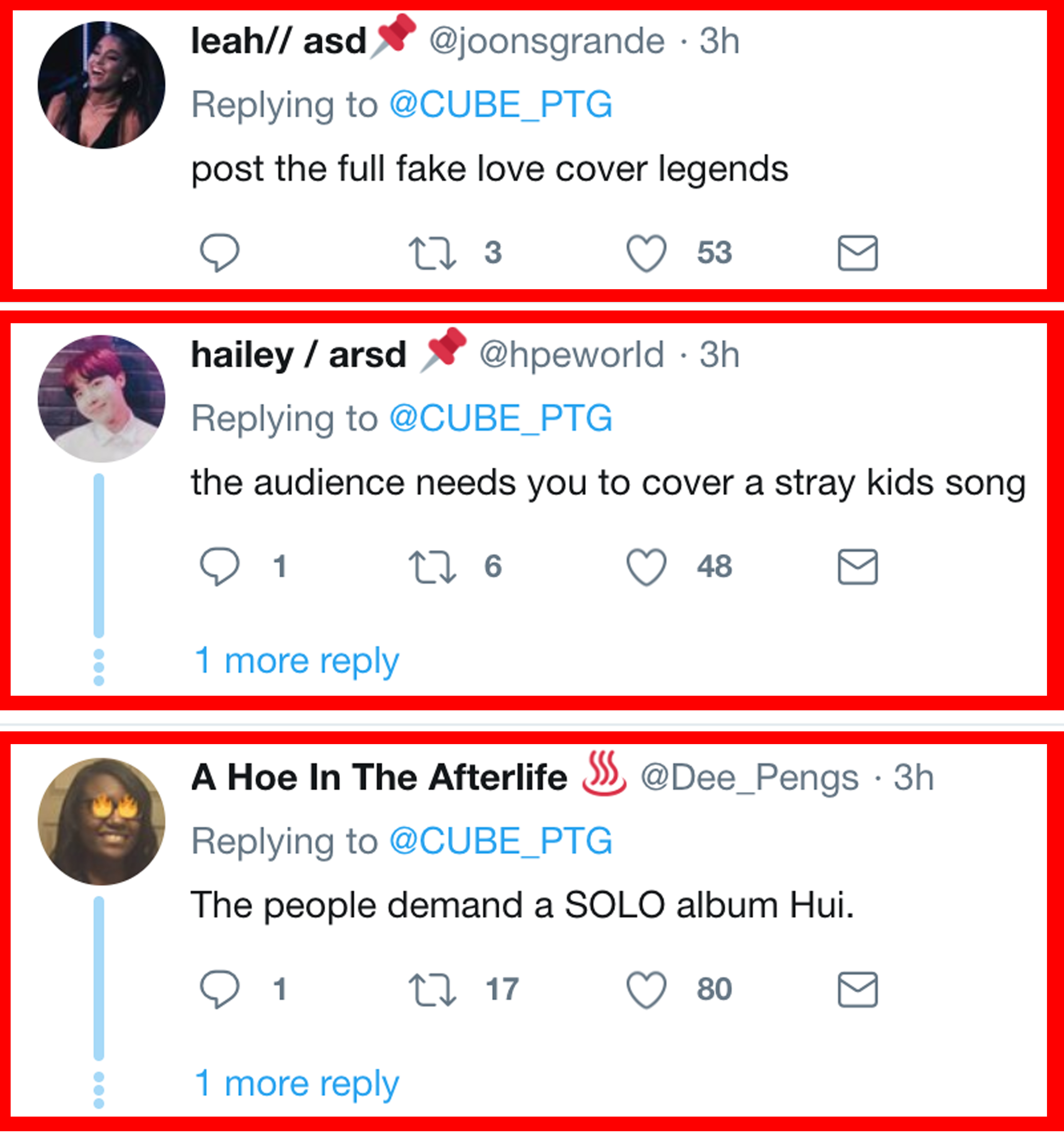 Không chỉ dừng lại ở những lời khen, người hâm mộ còn mong muốn Hui có thể cover lại những bản hit của những nhóm nhạc Kpop khác. Họ nói: “Hãy tung bản cover toàn bộ bài Fake Love đi anh”, “Khán giả rất cần bạn cover một bài hát của Stray Kids“, “Người hâm mộ thật sự cần Hui phát hành một album solo”.