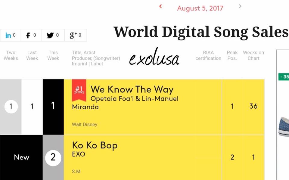 Các fan EXO liên tục nhận được những tin vui từ thần tượng. Cụ thể, Billboard vừa công bố The War - Full album thứ 4 từ boygroup nhà SM hiện đang đứng hạng 1 BXH trong tuần về lượng tiêu thụ. Ở Billboard 200, sản phẩm này cũng đang đứng ở vị trí 87 - Con số khá ấn tượng dành cho 1 album Kpop. Bên cạnh đó thì bài hát chủ đề Ko Ko Bop hiện đang đứng hạng 2 về mảng nhạc số trên toàn cầu. Các bài hát tiếp theo The Eve, Forever lần lượt giữ vị trí 8 và 24.