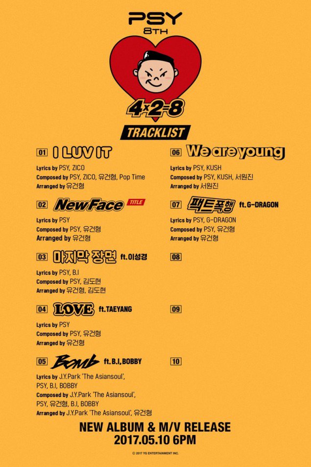 PSY lại khiến fan “đứng ngồi không yên” khi tiết lộ thông tin về 3 ca khúc tiếp theo trong album mới. Đáng chú ý là bài hát Fact Abuse với sự kết hợp cùng trưởng nhóm Big Bang: G-Dragon. Bên cạnh đó, Ca khúc chủ đề NewFace sẽ được phát hành MV vào 6 giờ tối ngày 10/5 (giờ địa phương).