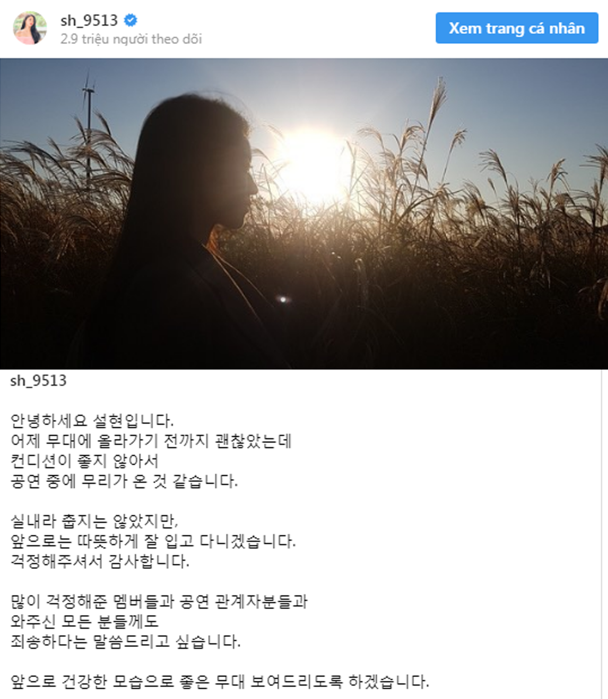 Không để fan lo lắng cho mình quá lâu, mới đây, Seolhyun đã trấn an và gửi lời xin lỗi tới với người hâm mộ và các thành viên của lại vì để họ phải lo lắng về tình trạng sức khỏe gần đây của mình. Trên Instagram của mình, cô viết: “Xin chào các bạn, tôi là Seolhyun đây. Tôi đã rất ổn cho đến khi tôi lên sân khấu vào ngày hôm qua. Sức khỏe của tôi lúc đó rơi vào tình trạng rất xấu thế nhưng đã có rất nhiều người đã đến buổi biểu diễn nên tôi vẫn cố gắng lên sân khấu.”