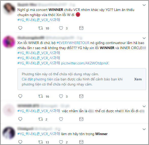 Đứng trước làn sóng phẫn nộ của người hâm mộ, cuối cùng giám đốc Jeung Chi Young của YG đã gửi lời xin lỗi trên trang chính thức của YG Entertainment: “Gửi Inner Circle yêu quý, với tư cách là giám đốc bộ phận biểu diễn trực tiếp và thay mặt cho YG Entertainment, tôi muốn dành một chút thời gian để bày tỏ lời xin lỗi chân thành của mình về sự cố trong concert “ TOUR WINNER 2018 EVERYWHERE TOUR cuối tuần qua ở KUALA LUMPUR. ”