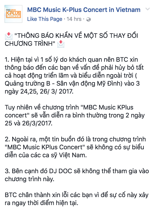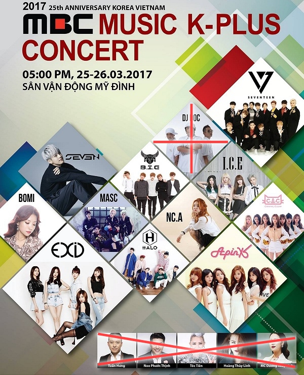 Những ngày qua, người hâm mộ làn sóng Hallyu ở Việt Nam dường như dồn toàn bộ sự quan tâm vào đêm nhạc MBC Music K-Plus sẽ diễn ra tại sân vận động quốc gia Mỹ Đình trong 2 ngày 25, 26/3. Sau một loạt thông tin về sự trồi, lặn bất thường của Noo Phước Thịnh trên poster chương trình, mới hôm qua, phía BTC lại tiếp tục “dội gáo nước lạnh” khi thông báo rằng sẽ không có sự xuất hiện của nghệ sĩ Việt Nam trong concert. Bên cạnh đó, thêm một cái tên “rơi” khỏi danh sách trình diễn là DJ Doc cũng được BTC thông tin trong cập nhật bên dưới.