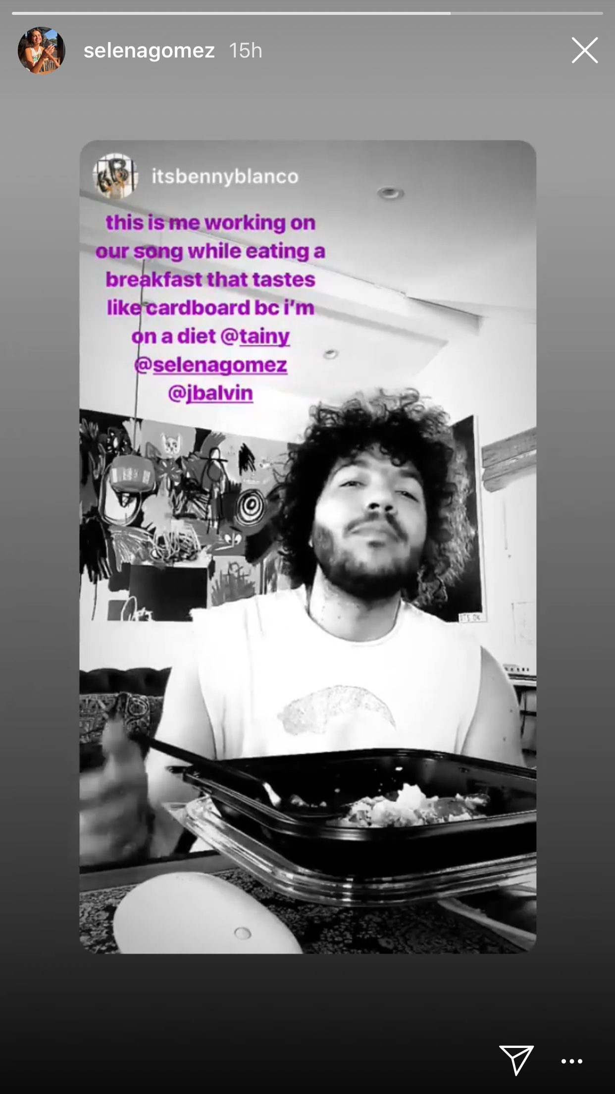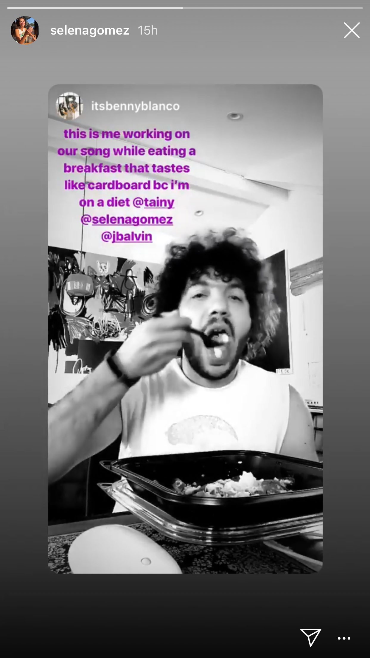 Không những thế, caption trong video còn nói rằng: ”Đây là tôi đang phối lại bài nhạc của mình trong khi ăn một bữa sáng thật tệ hại bởi vì tôi còn trong chế độ ăn kiêng” - Càng khiến cư dân mạng chắc nhẩm về một bom tấn phối hợp giữa các nghệ sĩ đình đám Tainy (Marco Masis), Selena Gomez và Jbalvin.