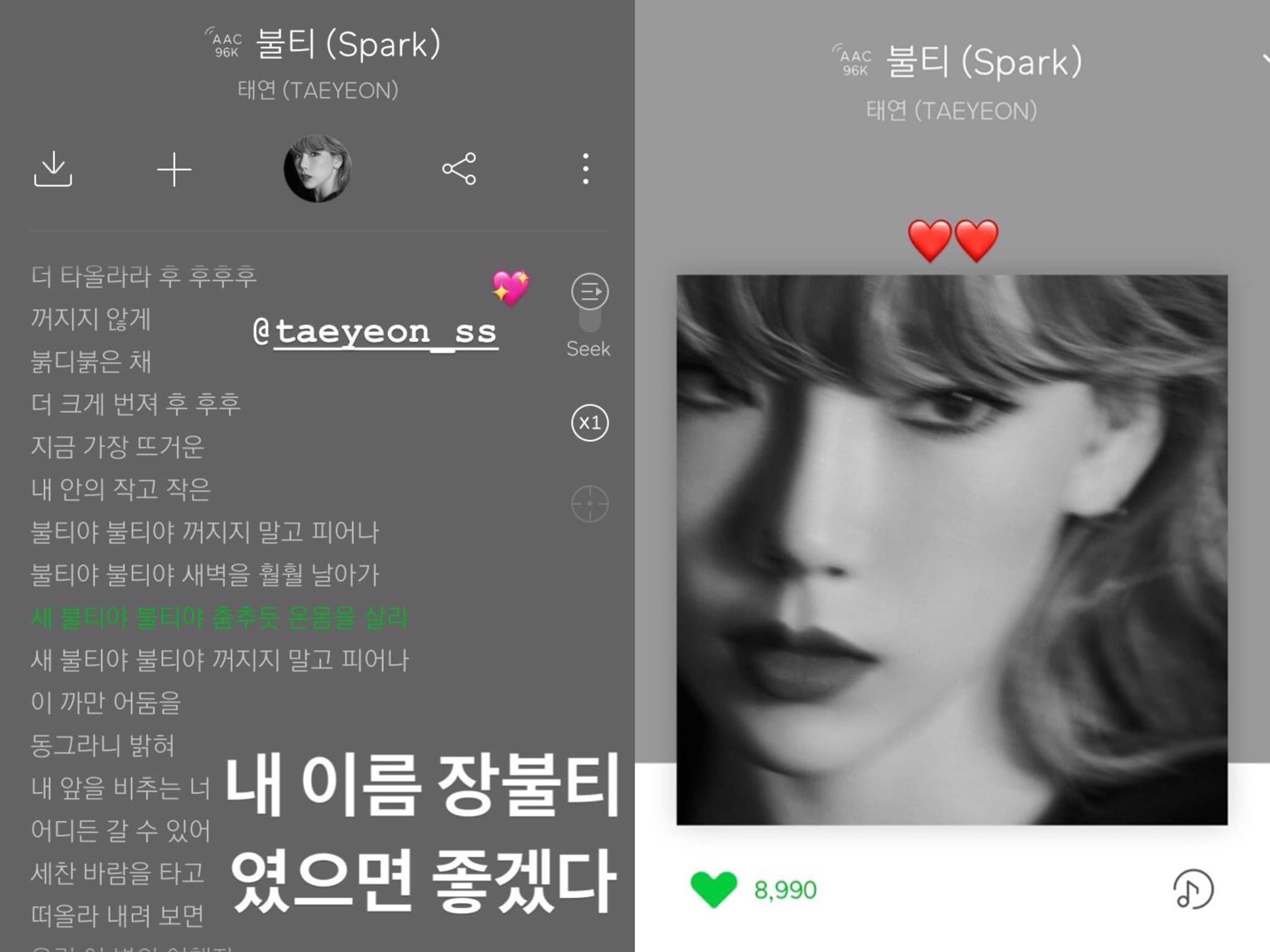 Cụ thể, Heize đã bày tỏ sự phấn khích của mình với dòng caption: “Ước gì tên của em là Jang Bulti nhỉ?”. Bởi vì trong phần lyric của SPARK có câu hát: “Bulti à”, dường như Heize đang không thể kiềm lòng trước lời gọi nhẹ nhàng, tình cảm của Taeyeon.
