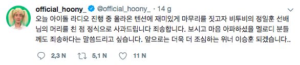 Nhận thấy tình hình khá căng thẳng, Seunghoon đã đích thân lên tiếng xin lỗi về hành động có phần quá trớn của mình bằng một bài viết trên trang Twitter chính thức của anh chàng. Nam ca sĩ viết: “Hôm nay trên chương trình Idol Radio, vì muốn kết thúc câu chuyện một cách vui vẻ, tôi đã đánh nhẹ lên đầu của tiền bối Ilhoon. Và tôi thực sự muốn xin lỗi vì điều đó. Tôi xin lỗi toàn thể Melody (tên fandom của BTOB) đã xem chương trình này và chắc hẳn tôi đã làm tổn thương các bạn. Từ bây giờ, tôi hứa sẽ trở thành một WINNER Lee Seunghoon thận trọng hơn.” Hiện tại, dù anh chàng đã lên tiếng xin lỗi nhưng sự việc vẫn đang được bàn tán xôn xao trên các trang tin lớn tại Hàn Quốc.