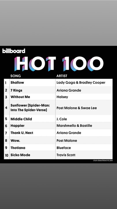 Bên cạnh đó, ca khúc Without Me của Halsey vươn lên ở vị trí thứ 3 của Billboard Hot 100, khiến cho cả 3 vị trí đầu tiên của BXH này đều đang được thống trị bởi các nghệ sĩ nữ, lần lượt là Shallow, 7 Rings và Without Me ở vị trí thứ #1, #2 và #3. Đã 5 năm rồi kể từ năm 2014 thì Billboard Hot 100 mới lại “đỏ rực” tên các nghệ sĩ nữ đến như vậy.