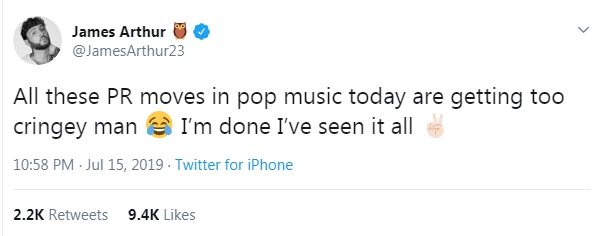 Cụ thể, James Arthur đã đăng lên trang Twitter của mình một dòng trạng thái bóng gió nói về những chiêu trò PR trong âm nhạc hiện tại khiến anh cảm thấy quá thấp hèn và anh cũng nhấn mạnh mình đã nhìn thấy hết tất cả những việc làm đó. Ngay khi dòng tweet được đăng tải, rất nhiều người đã nghi ngờ James đang cố tình ám chỉ đến cặp đôi Shawn Mendes và Camila Cabello bởi ở thời điểm hiện tại, đây chính là cặp đôi nổi tiếng nhất.