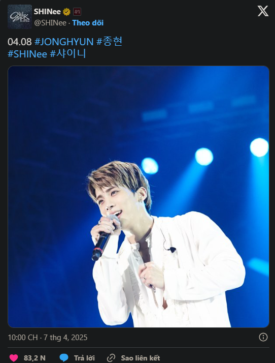 Vào ngày 8 tháng 4 theo giờ Hàn Quốc, SHINee đã chia sẻ một bức ảnh của Jonghyun – thành viên quá cố của nhóm – kèm dòng chú thích đơn giản “04.08” cùng hashtag tên anh. Bài đăng như một lời tri ân dịu dàng nhưng đầy cảm xúc để kỷ niệm ngày sinh của Jonghyun, người đã để lại dấu ấn sâu sắc không chỉ trong lòng các thành viên SHINee mà còn với hàng triệu người hâm mộ trên khắp thế giới.