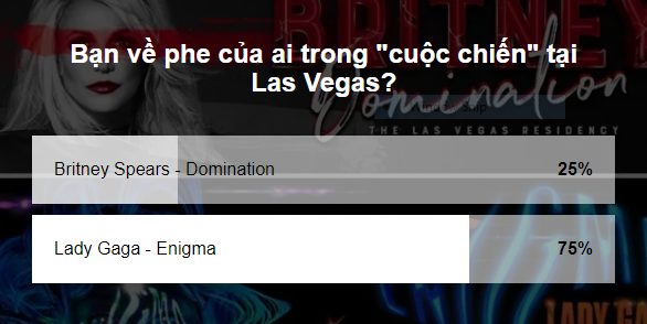 Trong bài viết “'Domination' và 'Enigma' chuẩn bị 'phát nổ' tại Las Vegas: Bạn chọn Britney Spears hay Lady Gaga?”, SAOstar đã mở một cuộc bình chọn để tìm ra đâu là show diễn Las Vegas được trông mong nhất hiện tại - Domination của Britney Spears hay Enigma của Lady Gaga. Và kết quả cuối cùng như sau.