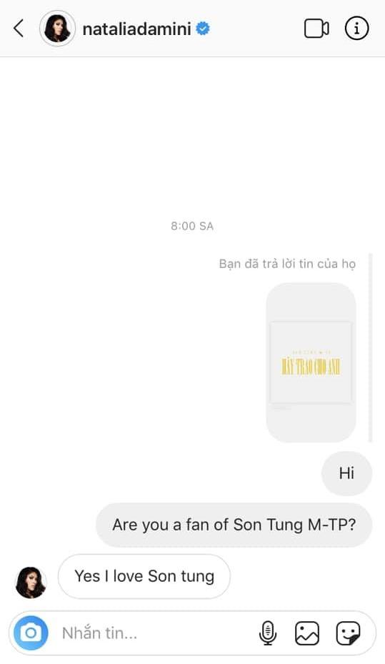 Cụ thể, trên story Instagram của nữ nghệ sĩ quốc tế Natalia Damini cũng đã đăng tải hình ảnh dự án Hãy trao cho anh. Thậm chí, có fan còn thẳng thắn đặt câu hỏi và cũng được Natalia đáp lại rằng cô rất yêu mến Sơn Tùng? Và trên trang Instagram của mình, nữ ca sĩ còn không quên đăng tải poster MV Hãy trao cho anh và bày tỏ sự hồi hộp, chờ đợi. Thế nhưng, khi sản phẩm chính thức được “thả xích” thì lại hoàn toàn không thấy một chút bóng dáng nào của Natalia!?
