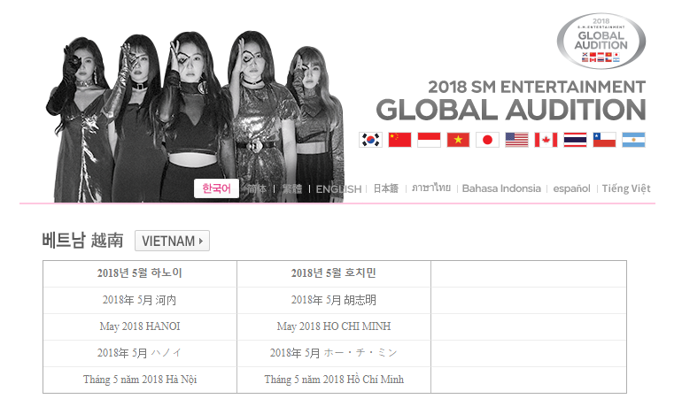 SM Entertainment - một trong những công ty giải trí lớn nhất Hàn Quốc sẽ tổ chức tuyển chọn thực tập sinh tại các nước trong khu vực vào năm 2018. Điều thú vị là Việt Nam có tên trong danh sách các quốc gia mà “ông lớn” này ghé qua. Mới đây trên website chính thức, SM đã cập nhật phần tiếng Việt cũng như xác nhận thời điểm tuyển sinh tại TP HCM và Hà Nội vào tháng 5/2018.