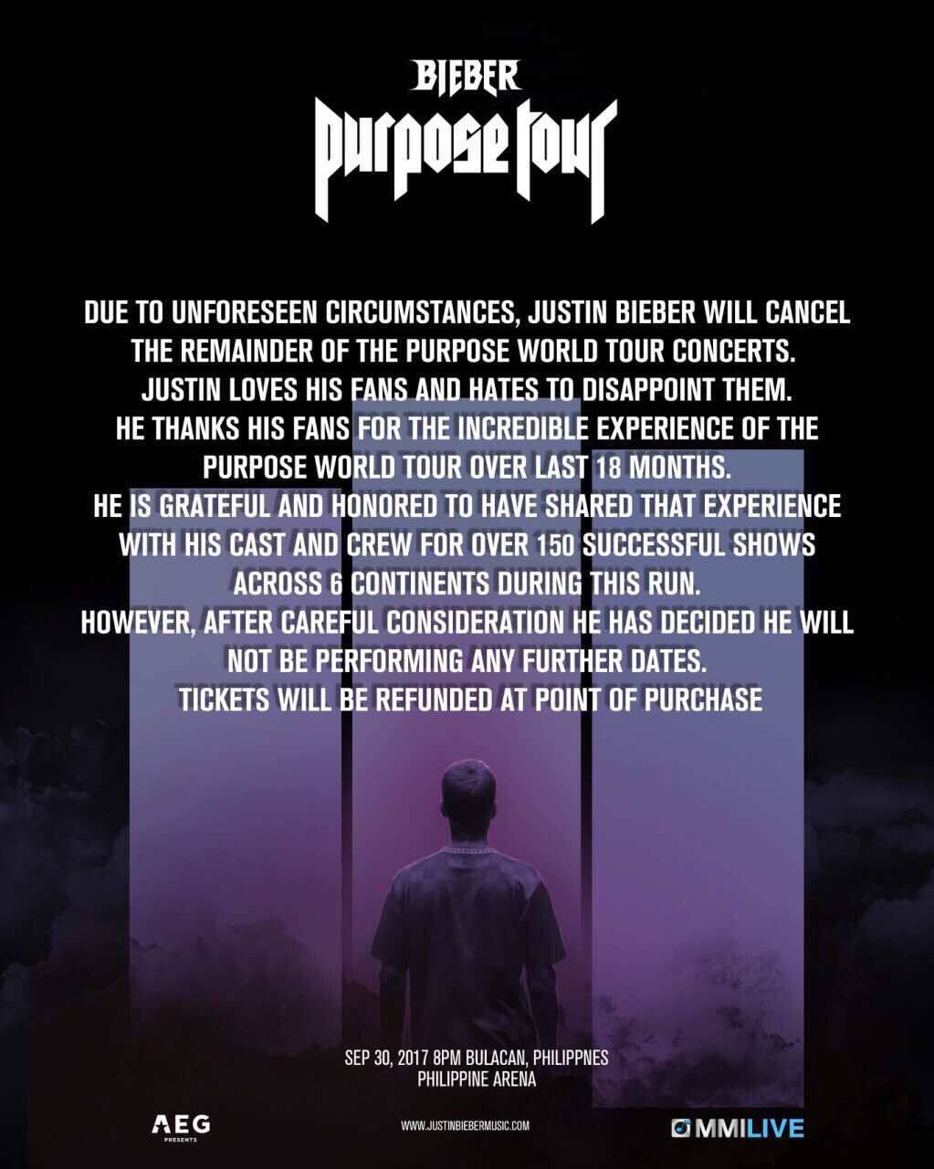 “Vì những tình huống không lường trước được, Justin Bieber sẽ huỷ toàn bộ đêm diễn còn lại của Purpose World Tour. Justin yêu người hâm mộ và không muốn làm họ thất vọng. Anh ấy rất biết ơn fan vì những trải nghiệm tuyệt vời trong suốt Purpose Tour 18 tháng vừa qua. Anh ấy rất tự hào và hãnh diện khi được chia sẻ điều này đến tất cả mọi người sau 150 show diễn tại 6 lục địa. Tuy nhiên, sau khi đã suy xét kĩ lưỡng, anh ấy quyết định sẽ không trình diễn tiếp ở một đêm nào nữa. Tất cả vé đều sẽ được hoàn lại tiền”.