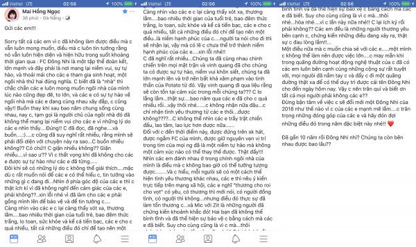 Ngay sau đó, Đông Nhi đã gửi đến người hâm mộ những dòng tâm sự chân thành và thẳng thắn nhìn nhận vấn đề đang xảy ra với chính sự nghiệp của mình cũng như đối với FC. Cùng với đó, cô nàng cũng âm thầm khoá trang cá nhân để tránh những ồn ào không đáng có.
