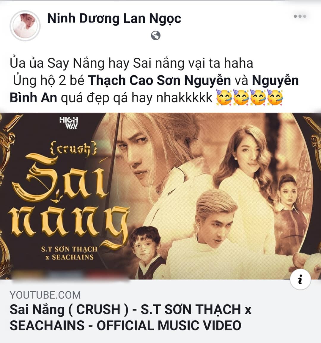 Cụ thể mới đây, Ninh Dương Lan Ngọc đã chia sẻ trên trang cá nhân của mình MV mới từ S.T Sơn Thạch với dòng caption đầy sự thích thú: “Ủa ủa Say nắng hay Sai nắng vậy ta? Ủng hộ 2 bé Sơn Thạch và Bình An quá đẹp quá hay nha”. Dòng chia sẻ của Ninh Dương Lan Ngọc đã khiến cho khán giả và người hâm mộ không khỏi thích thú vì cô nàng đã “công khai” bắt lỗi tựa đề ca khúc của S.T Sơn Thạch.