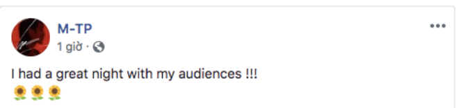Nếu bạn vẫn còn ở lại bài viết này để chờ đợi điều Sky quan tâm là gì. Thì cụ thể, cộng đồng fan này lại “soi” caption mà thần tượng viết. Ai cũng biết đó giờ, Sơn Tùng mặn cái gì chứ riêng khoản caption đăng facebook thì cần một liệu trình điều trị dài (rất dài) hạn để có thể… bớt nhạt. Đó chính là lý do khi anh chàng lựa chọn câu nói tiếng Anh (khá dài đối với anh ấy): I had a great night with my audiences thì fan một lần nữa được dịp “dìm” thần tượng.
