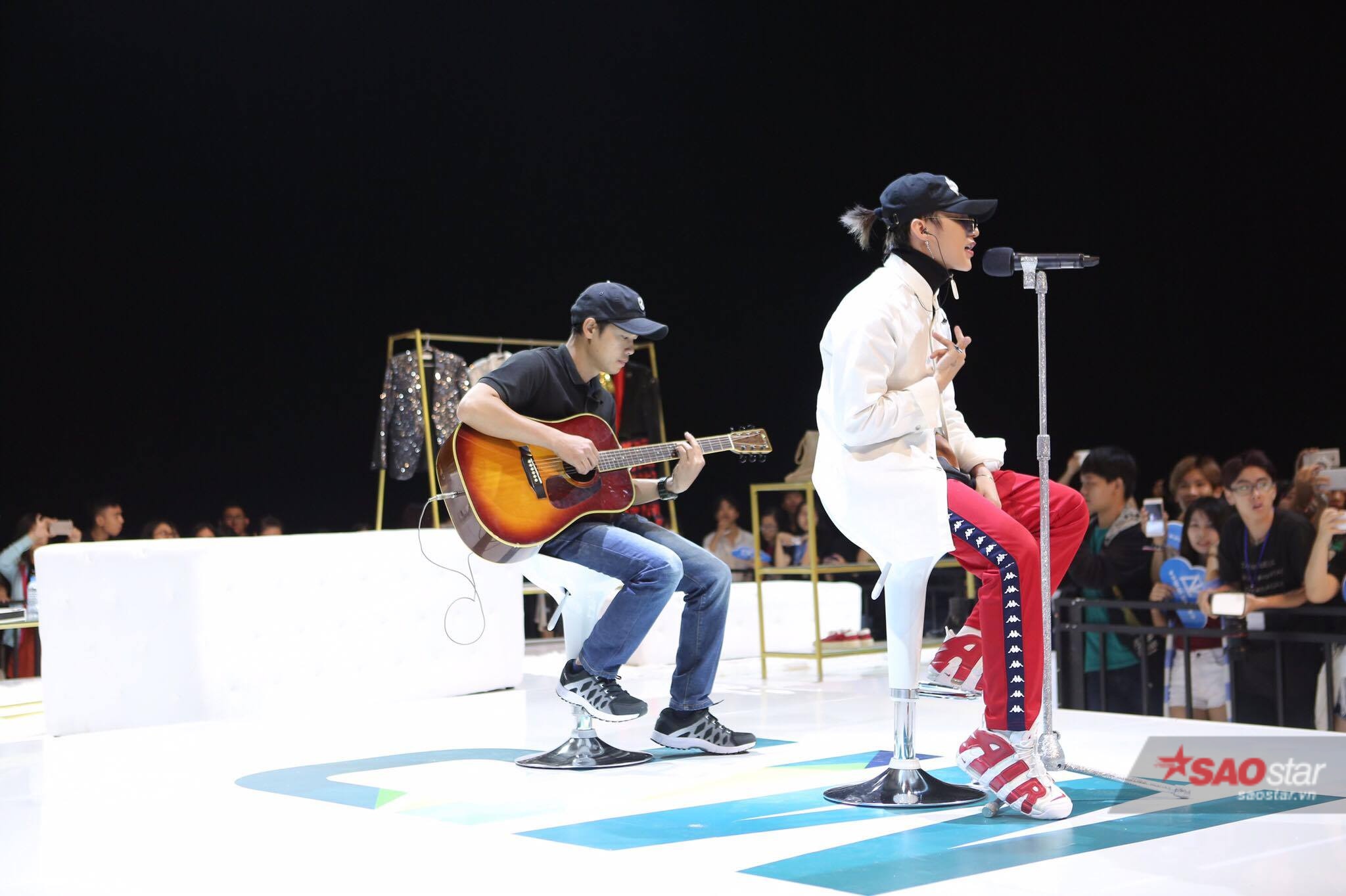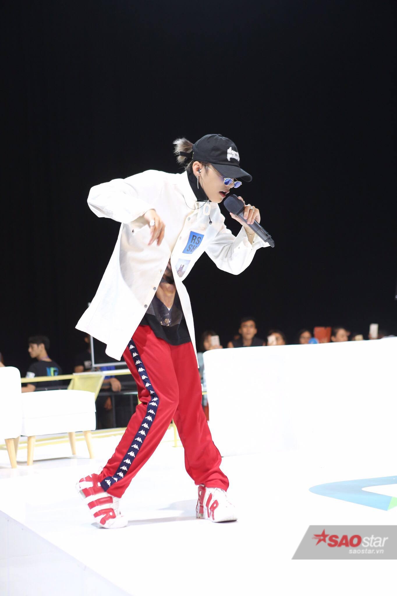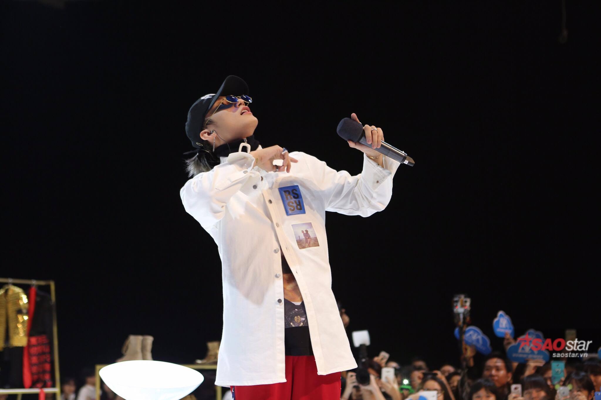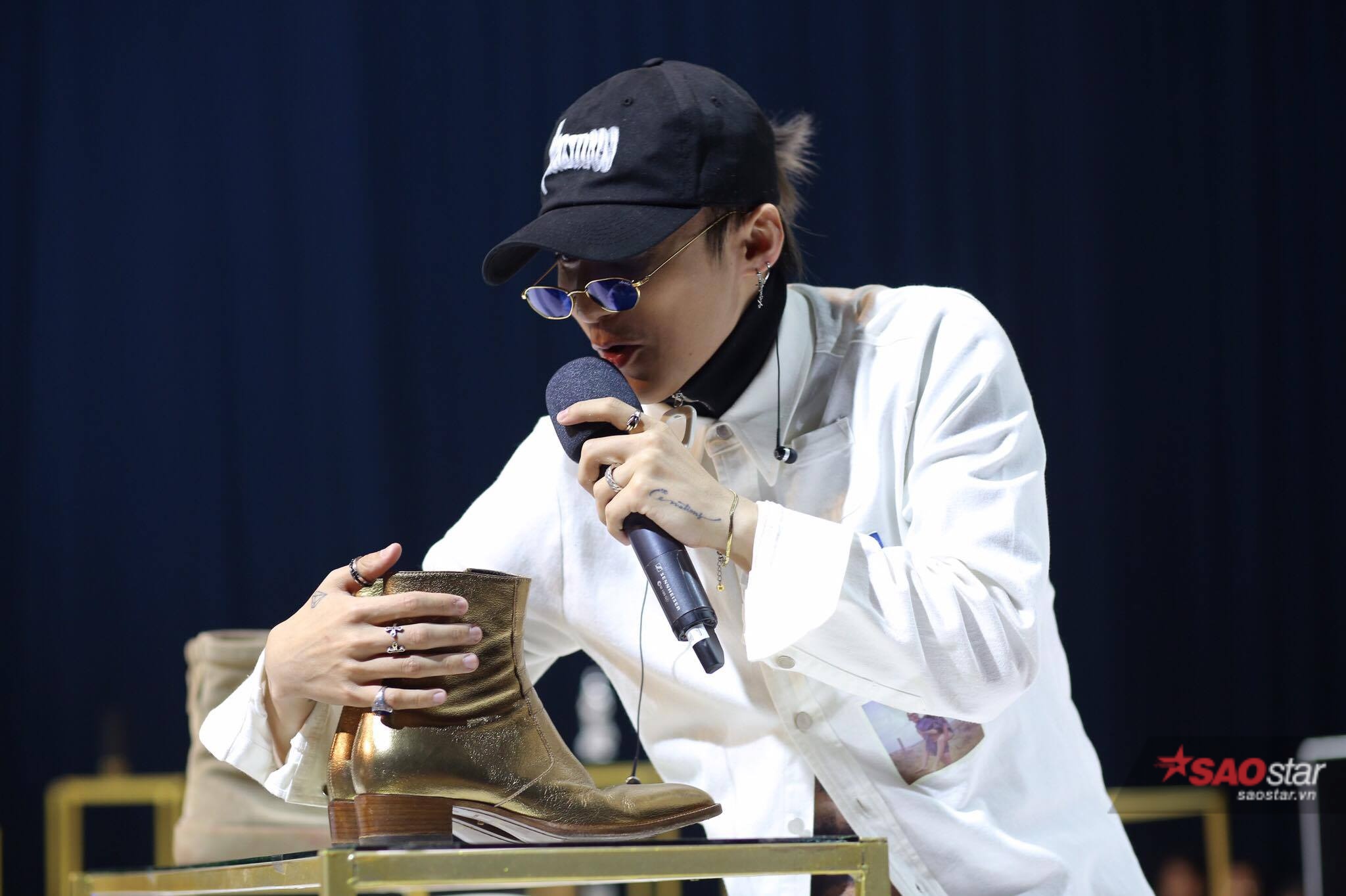 Xuất hiện trên sân khấu buổi họp fan, Sơn Tùng diện trang phục cá tính.