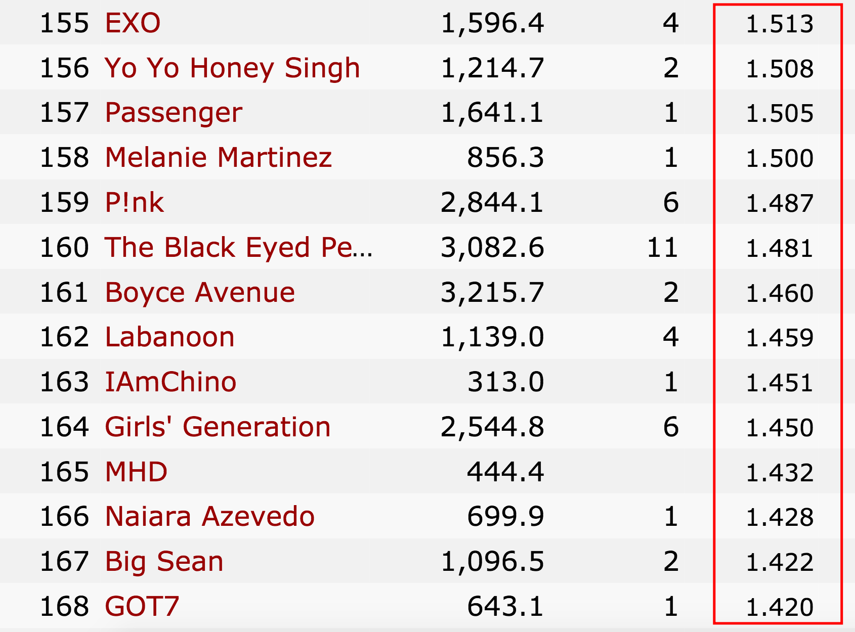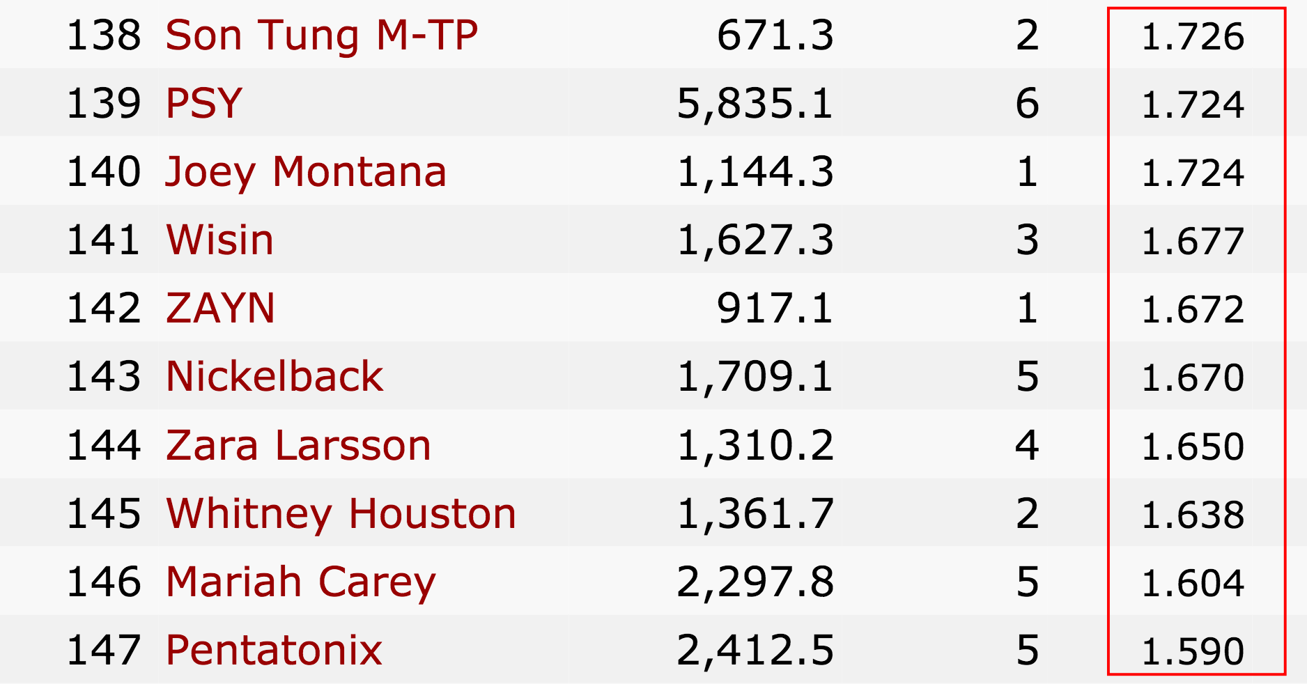 Tất nhiên BXH này chỉ mang tính tương đối, bởi những thống kê như thế còn phụ thuộc nhiều vào các sản phẩm nghệ sĩ ra mắt vào thời điểm được tính. Có nhiều sản phẩm mới tức sẽ thu hút nhiều lượt view và ngược lại, sự im ắng sẽ kéo theo con số này đi xuống. Điển hình ở trường hợp của Sơn Tùng, từ đầu năm đến giờ, giọng ca này đã có đến 2 sản phẩm lập hàng loạt kỉ lục về view, trong số đó Lạc trôi đã vượt ngưỡng 100 triệu còn Nơi này có anh cũng sắp tiếp bước thành tích này trong ít ngày tới. Còn các sao lớn trên thế giới hiện tại khá thầm lặng về mặt âm nhạc nên thứ hạng bị giảm sút.