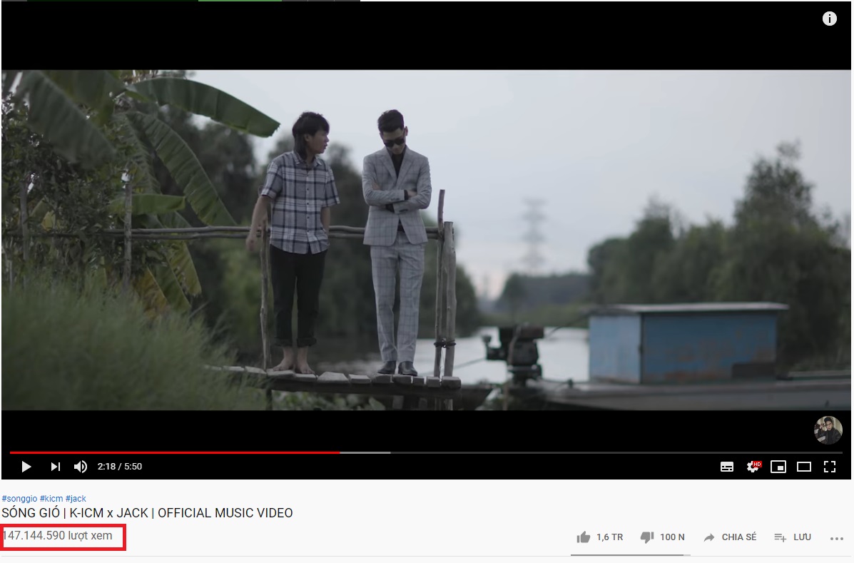 Trước đó, sau đúng hơn 24 ngày 3 giờ lên sóng, MV Sóng gió từ cặp đôi “cạ cứng” ra mắt ngày 12/7 vừa qua đã chính thức cán mốc 100 triệu views cùng hơn 1,5 triệu lượt thích trên Youtube. Cũng với thành tích nhanh một cách “chóng mặt” này, MV Sóng gió của Jack và K-ICM chính thức vượt qua sản phẩm Người lạ ơi (Orange, Karrik - 38 ngày) trong danh sách những MV đạt kỷ lục về thời gian cán mốc 100 triệu views Vpop.