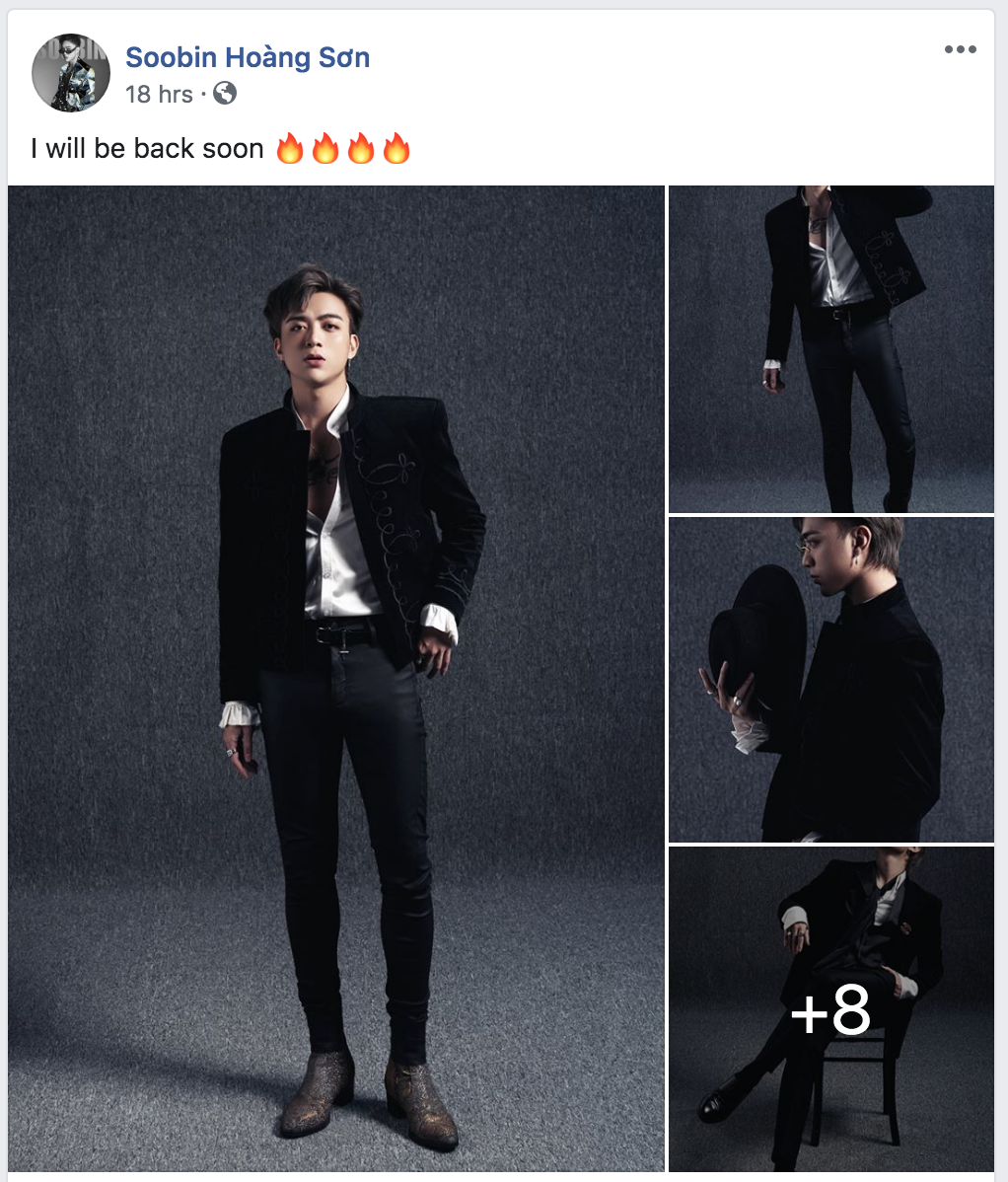 Điều này không phải không có căn cứ khi mà cách đây không lâu, nam ca sĩ đã bất ngờ “dọ ý” người hâm mộ cho màn tái xuất của mình. Trong bộ ảnh gần đây, nam ca sĩ Phía sau một cô gái diện 3 set đồ vest lịch lãm, điển trai, khác hẳn với hình ảnh bụi bặm, chất lừ mà anh xây dựng thời gian qua. Có vẻ như đây sẽ là hình tượng mà anh chàng dự định theo đuổi trong thời gian sắp tới. Bên cạnh đó, Soobin Hoàng Sơn ghi kèm caption “I will be back soon” (Tôi sẽ trở lại sớm), khiến fan vô cùng phấn khích, tràn đầy hi vọng thần tượng sẽ trở lại với sản phẩm âm nhạc trong thời gian gần.