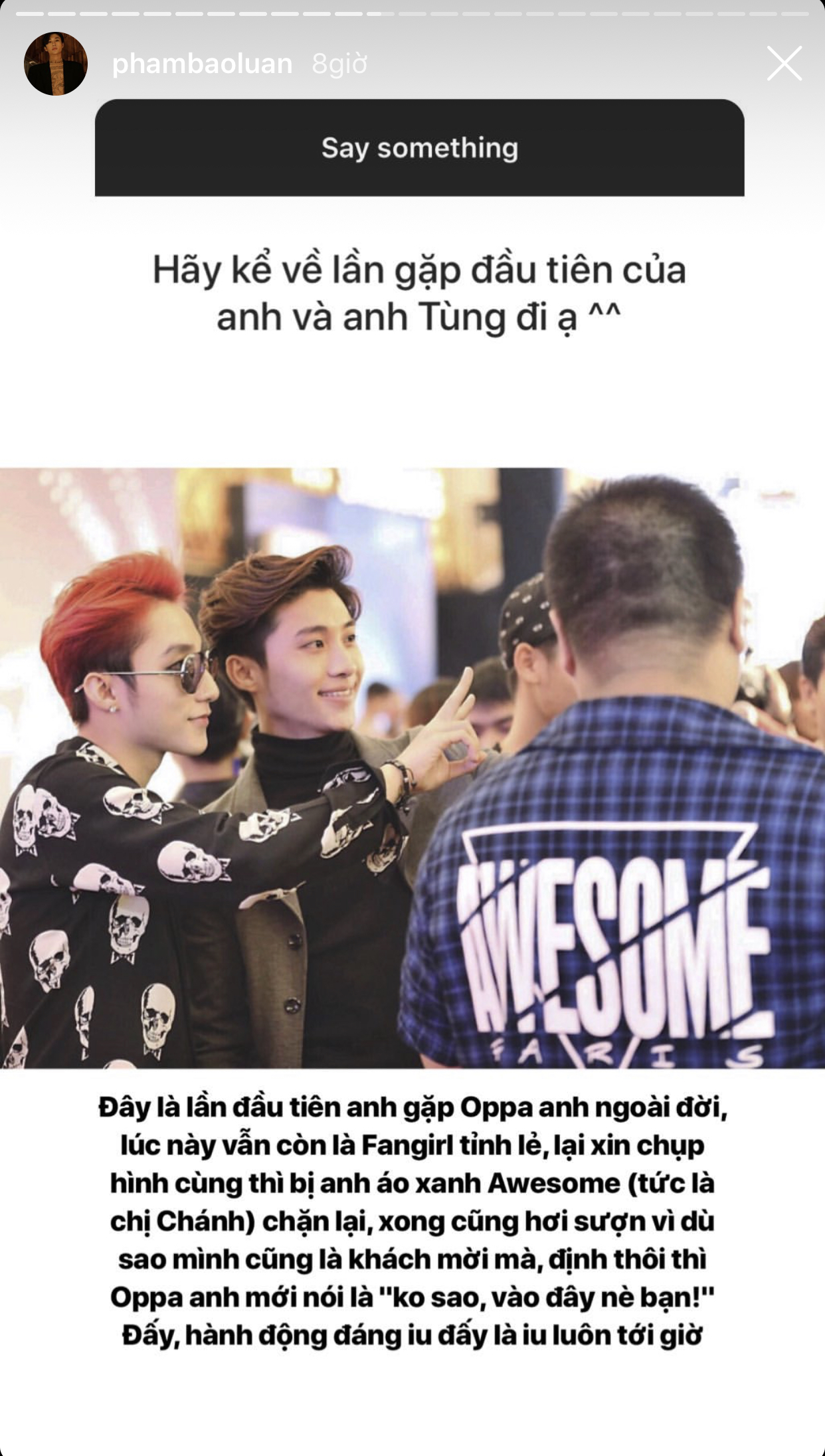 Anh chàng đã đăng tải một bức ảnh chụp cùng giọng ca Chạy ngay đi để minh họa cho lần đầu tiên 2 người gặp nhau, cùng dòng chia sẻ: “Đây là lần đầu tiên anh gặp oppa (Sơn Tùng M-TP) ngoài đời, lúc này vẫn còn là fangirl (Phạm Bảo Luận đùa vui mình là fangirl) tỉnh lẻ, lại xin chụp hình cùng thì bị anh áo xanh (quản lý của Sơn Tùng) chặn lại, xong cũng hơi ngượng vì dù sao mình cũng là khách mời mà, định thôi thì oppa mới nói là 'Không sao, vào đây nè bạn!'. Đấy, hành động đáng yêu đấy là yêu luôn tới giờ”.