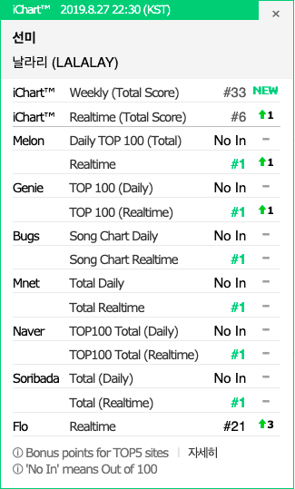 LALALAY của Sunmi sau khi ra mắt đã nhanh chóng leo vùn vụt lên vị trí đầu của 5 BXH lớn tại Hàn Quốc là Melon, Genie, Bugs, Mnet, Naver và Soribada. Tuy nhiên thành tích của LALALAY tại Flo chỉ dừng lại tại #3, nếu như ca khúc mới của Sunmi đạt #1 tại hệ thống này thì nữ ca sĩ sẽ lập tức nhận về Allkill cho mình. Với âm nhạc bắt tai kết hợp cùng phần MV vô cùng ấn tượng, LALALAY của Sunmi đã dễ dàng chinh phục được khán giả cũng như người hâm mộ.