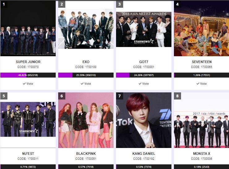 Tính đến thời điểm này (25/11) của vòng bình chọn thứ 3 - Second Vote đã chứng kiến nhiều sự chuyển biến đầy bất ngờ. Giữa những gương mặt trẻ tuổi đầy hứa hẹn, đàn anh Super Junior vẫn đứng đầu bảng xếp hạng với 46,82% (652218 lượt bình chọn) bỏ lại 1 khoảng cách khá xa với đàn em cùng nhà EXO đứng ở vị trí thứ 2 với 25.59% (356510 lượt bình chọn). Đứng ở vị trí thứ 3 là những anh chàng Got7 của nhà JYP với 24,26% (356510 lượt bình chọn). Có thể thấy cộng đồng EXO-L đã tích cực bình chọn chăm chỉ để đưa các chàng trai của mình lên vị trí thứ 2 khi mà trước đó vị trí này thuộc về các anh chàng Got7.