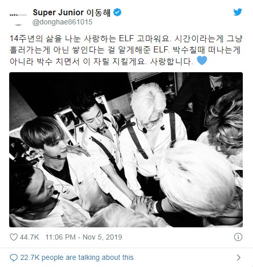 Donghae thì chọn bức ảnh cả nhóm quây quần bên nhau, thể hiện sự đoàn kết trước giờ biểu diễn để đăng tải trên Twitter cá nhân của mình với nội dung đầy cảm động: “Cảm ơn ELF đáng yêu, những người đã cùng chúng mình chia sẻ 14 năm vừa qua. ELF, các bạn khiến mình nhận ra rằng, thời gian không chỉ đơn giản trôi qua mà đó còn là sự tích lũy. Thay vì rời đi dưới những tiếng vỗ tay tán dương, mình sẽ ở đây để vỗ tay chung vui cùng các bạn. Mình yêu các bạn rất nhiều!”