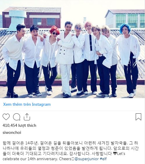 Siwon cũng chọn bức hình chụp cả nhóm để chung vui ngày đặc biệt này với nội dung: “Nhìn lại những quãng đường đã đi qua, mình có thể nhìn thấy những dấu chân đã bắt đầu phai nhạt. Mình đã tìm thấy niềm đam mê và tuổi trẻ của chúng mình qua những dấu chân đó và mong chờ nhiều hơn vào tương lai phía trước của chúng ta. Cảm ơn các bạn! Mình yêu các bạn rất nhiều!” Anh chàng còn tinh tế kèm theo nội dung Tiếng Anh dành cho các fan Quốc tế: “Let’s celebrate our 14th anniversary. Cheers.”