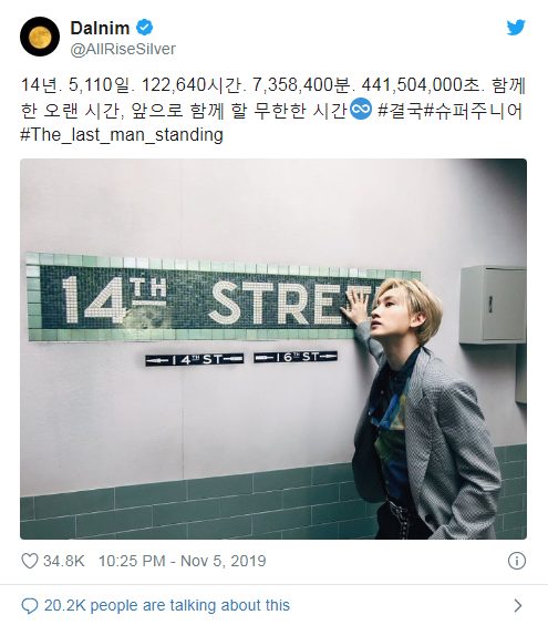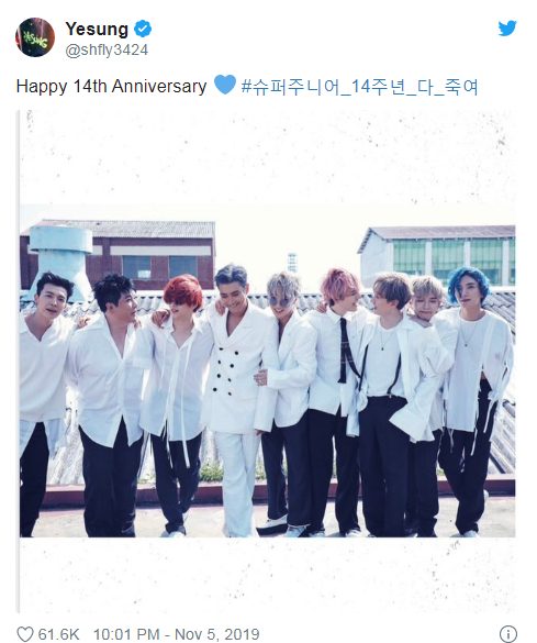 Yesung đăng tải bức ảnh các thành viên trên Twitter với nội dung chúc mừng kỷ niệm 14 năm.