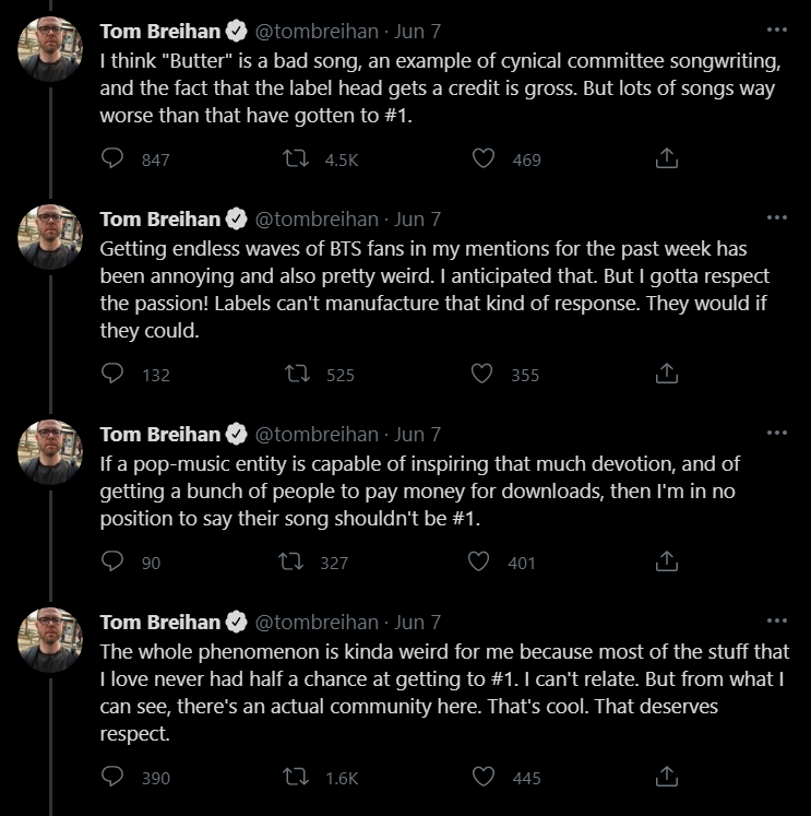 Sau khi nhận được nhiều phản hồi, mới đây, Tom Breihan đã lên tiếng công nhận mình đã sai khi giữ định kiến với BTS và cũng cho rằng Billboard vốn dĩ luôn bị thao túng từ trước đến nay.