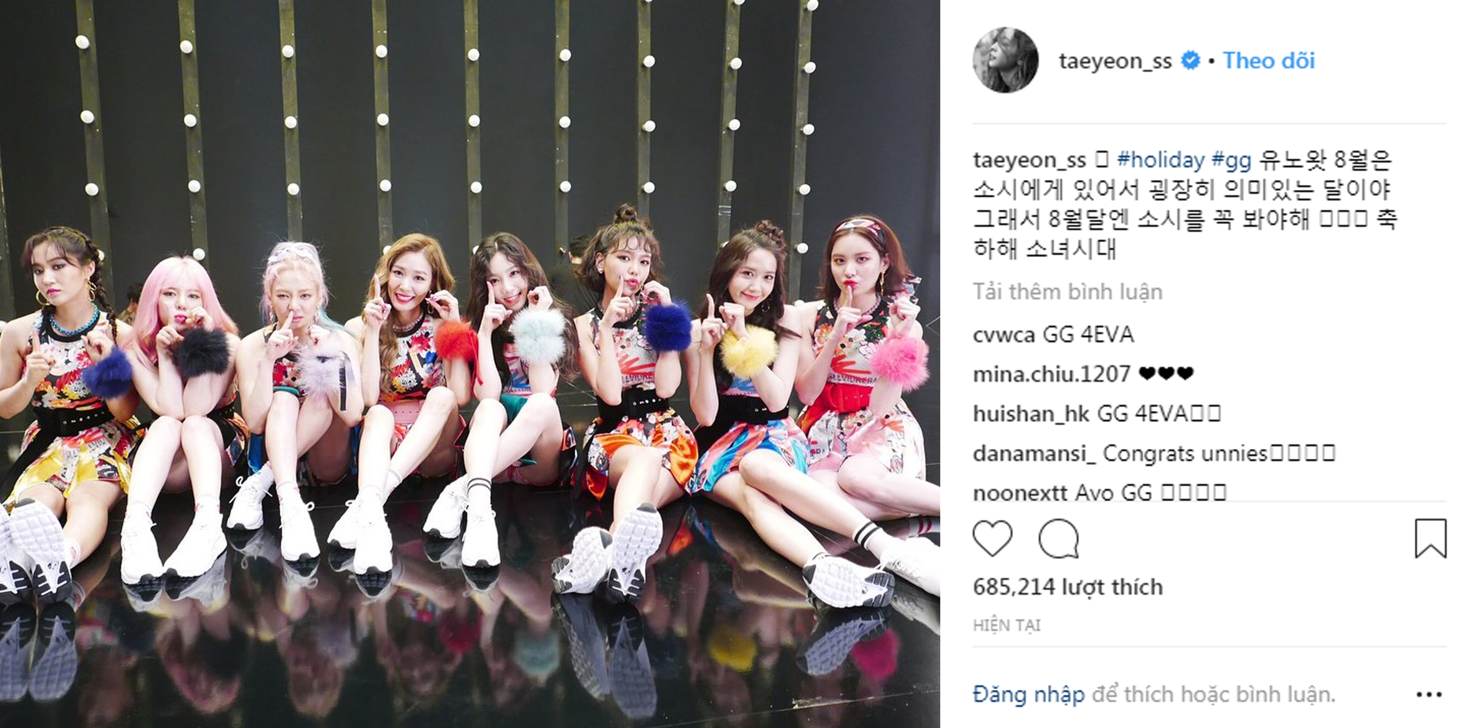 Ngày 4/8, Taeyeon đã đăng tải những bức ảnh của 8 thành viên Girls' Generation trên Instagram cùng với dòng caption: “Tháng Tám là một tháng rất đặc biệt dành cho Girls' Generation. Đó là lý do tại sao bạn thực sự phải theo dõi chúng tôi vào thời điểm này. , Girls 'Generation”. Được biết, nhóm nhạc nữ nhà SM Entertainment chính thức ra mắt vào ngày 3/8 năm 2007 với bản hit Into the New World, và dường như Taeyeon đang muốn người hâm mộ nhớ lại ngày kỷ niệm đặc biệt này.