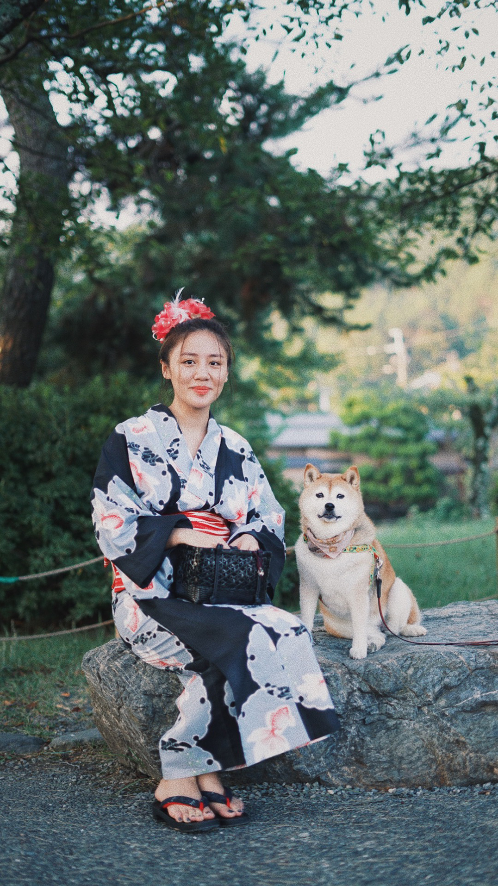 Văn Mai Hương diện kimono đùa vui với 1 chú chó.