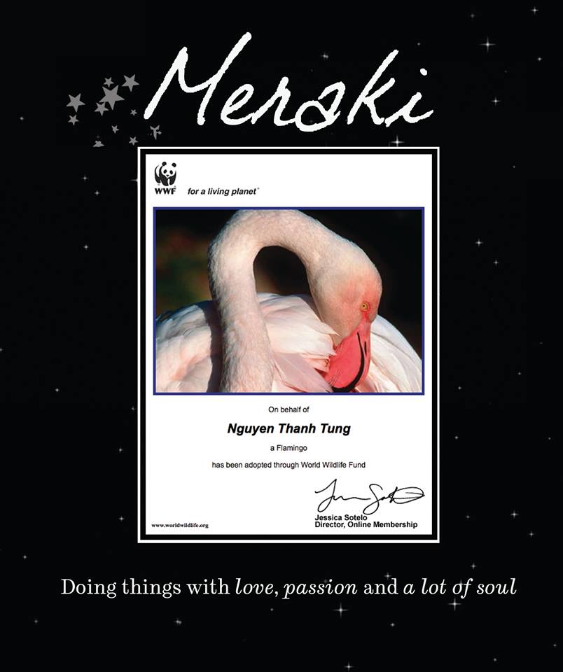 Em hồng hạc xinh đẹp chúng mình nhận nuôi dưới tên Nguyễn Thanh Tùng có tên là 'Meraki'. 'Meraki' là một từ trong tiếng Hy Lạp cổ, có ý nghĩa là, 'làm một điều gì đó bằng cả trái tim tâm hồn, thậm chí đặt cược cả bản thân' (theo bản dịch của Chuyện). Vì sao lại chọn hồng hạc, vì sao lại đặt tên như vậy?