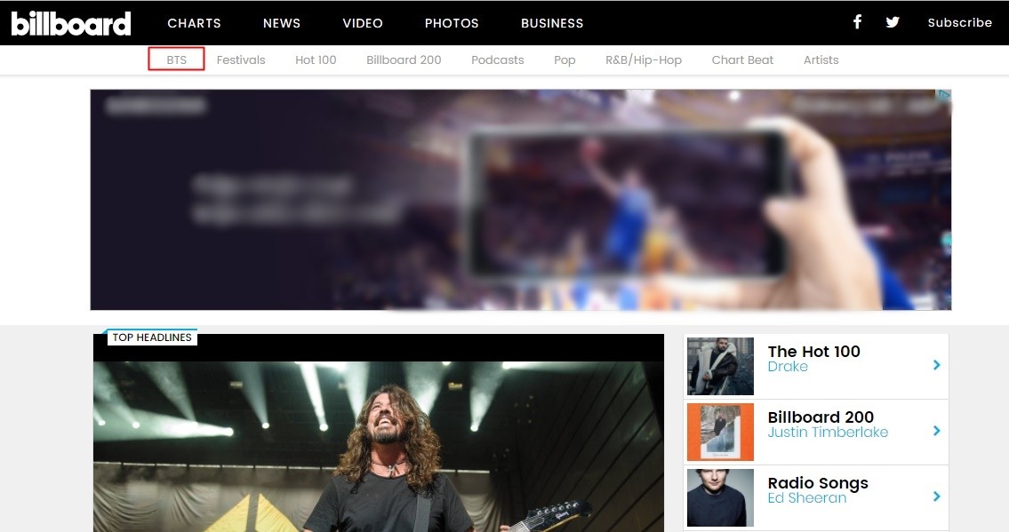 Tuy nhiên đó chưa phải là tất cả. Mới đây, tạp chí danh tiếng Billboard đã khiến tất cả phải sửng sốt khi dành cho gà chiến nhà Big Hit hẳn một mục riêng trên trang chủ. Ngay cả những gương mặt đình đám như Taylor Swift, Justin Bieber, Lady Gaga, Katy Perry… cũng chưa từng có vinh dự này.
