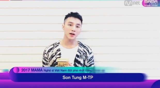 Lễ trao giải 2017 Premiere MAMA in VietNam diễn ra tại nhà hát Hòa Bình vào tối 25/11/2017 là một trong những sự kiện cuối năm thu hút đông đảo sự quan tâm của khán giả. Không chỉ được tận mắt ngắm nhìn dàn sao Kpop hội tụ mà các nghệ sĩ của Việt Nam cũng vinh dự được xướng tên tại giải thưởng này. Và với hạng mục Nghệ sĩ Việt Nam xuất sắc nhất, Sơn Tùng M-TP xuất sắc được MAMA 2017 gọi tên. Mặc dù không có mặt để nhận giải nhưng nam ca sĩ đã kịp quay clip để gửi lời cảm ơn tới chương trình cũng như người hâm mộ.