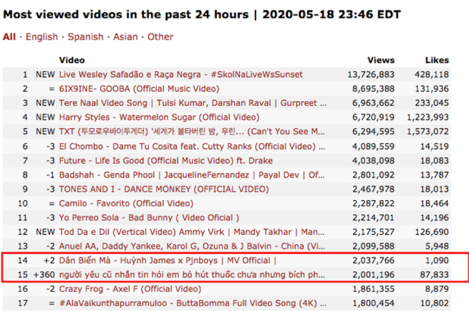 Cuối ngày 18/5, MV còn lọt top 15 MV được xem nhiều nhất thế giới 24 giờ qua.